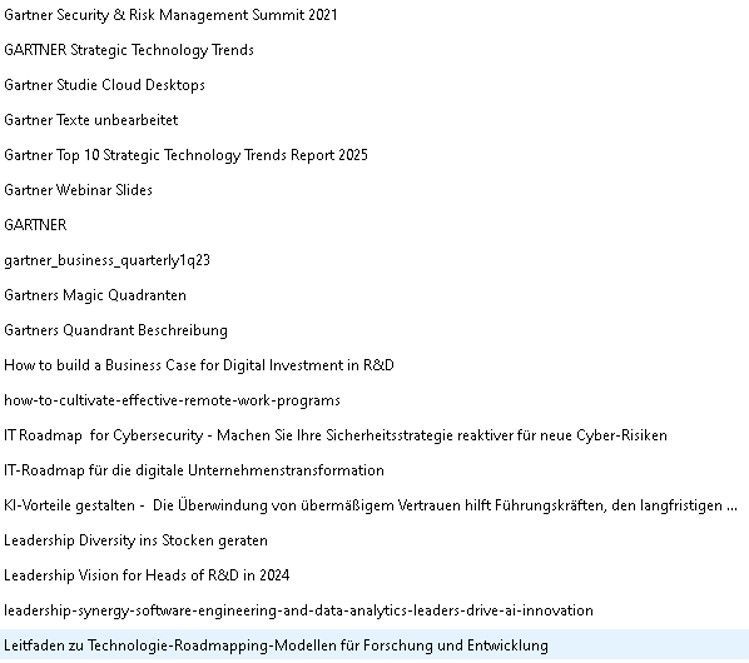Auf dieser Seite haben wir einige wenige Dokumente aufgelistet, jeweils mit den Zusammenfassungen, die bei Bedarf zur Verfügung gestellt werden können.