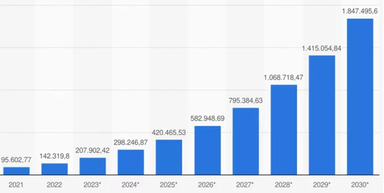 Der Markt wird etwa 231,90Mrd. € im Jahr 2025 betragen. Es wird erwartet, dass die Marktgröße eine jährliche Wachstumsrate (CAGR 2025-2031) von 36,89% aufweist, was zu einem prognostizierten Marktvolumen von 1,54Bio. € im Jahr 2031 führt. ( zit. Statista)